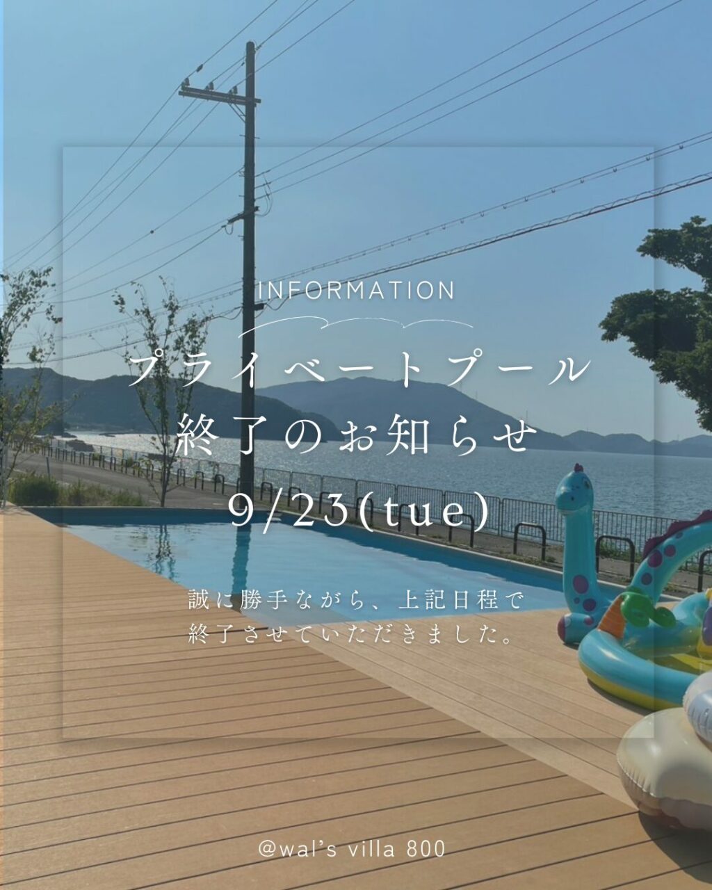 2025.09.24 お知らせ 『プライベートプール』営業終了のお知らせ 気温の変化などから、9/23(火)を持ちまして、「プライベートプール」の2025年の営業を終了させて頂きました。沢山の方にご利用頂きありがとうございました。 2026年のスケジュールはHPにてご案内させて頂きます。